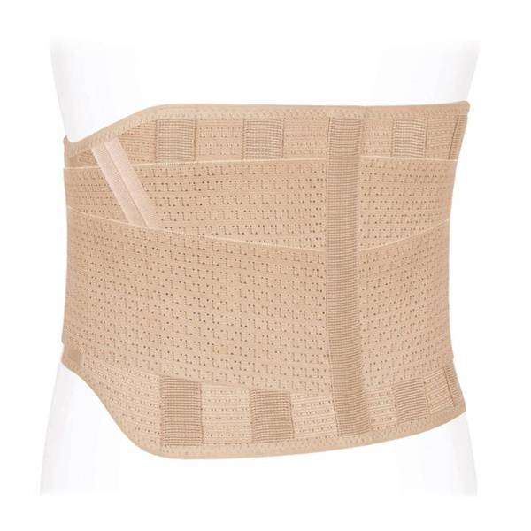 This breathable, moisture-wicking cotton-rich lumbar support corset provides semi-rigid stabilization for the lower back. Ideal for moderate back pain relief and injury recovery. Features 4 plastic support stays (size S), 25cm height, and a beige color.