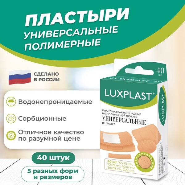 Description: LUXPLAST universal bactericidal plasters offer comprehensive wound care with 40 plasters in a tamper-evident package. This versatile assortment includes 5 sizes to suit various needs: 16 x 19x72mm, 10 x 12x40mm, 4 x 38x38mm, 4 x 25x72mm, and 6 Ø22mm round plasters. Featuring a waterproof, polymer backing, hypoallergenic adhesive, and chlorhexidine antiseptic, these flesh-toned plasters provide reliable protection for minor cuts, scrapes, and superficial wounds. Each plaster is designed for single use up to 24 hours. Ideal for home, travel, and first aid kits.