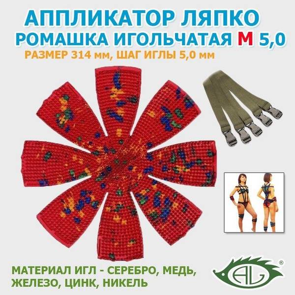 Lyapko applicator, Chamomile M 5.0, acupuncture mat, pain relief, back pain, headache relief, pelvic pain, medical applicator, iron, copper, nickel, zinc, silver, medical-grade rubber, flexible applicator, segmented applicator, hair growth, prostatitis, cystitis, hemorrhoids, impotence, frigidity, nocturnal enuresis, 314 mm, 2106 needles, alternative medicine.