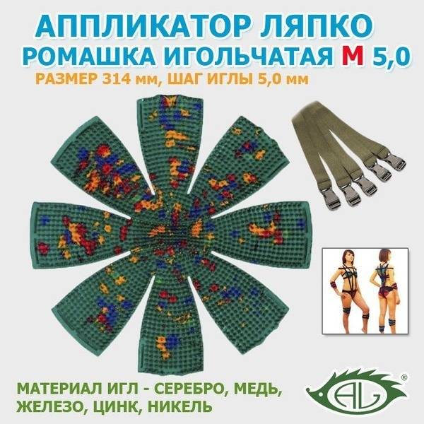 Lyapko applicator, Chamomile M, acupuncture applicator, pain relief, back pain, neck pain, headache relief, pelvic pain, infertility treatment, hemorrhoid treatment, prostate treatment, medical device, alternative medicine, natural pain relief, 314mm, 5.0mm spacing, iron, copper, nickel, zinc, silver, medical-grade rubber.