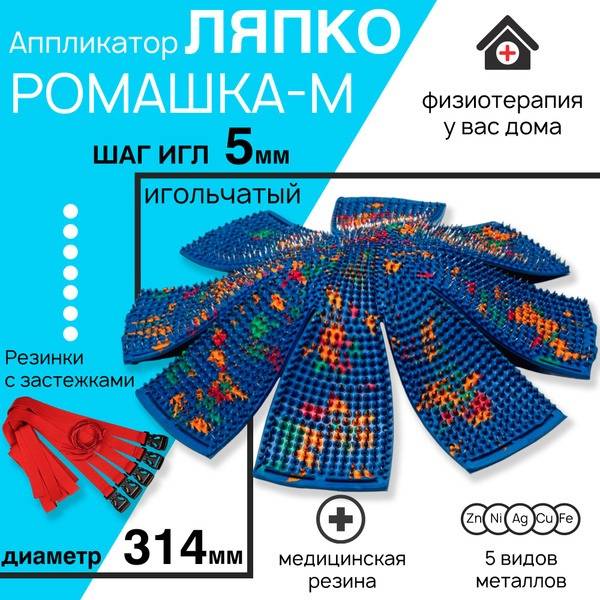 The Lyapko "Chamomile-M" applicator is a unique and versatile acupuncture mat designed for comprehensive pain relief and improved well-being. Unlike traditional Lyapko applicators, its innovative, flower-like design offers a large surface area and flexible "petals" that conform perfectly to the contours of various body parts, ensuring optimal contact and treatment. The segmented design allows for targeted application to specific areas, including hard-to-reach spots. Interconnecting laces and fastening straps allow for customization and secure placement.