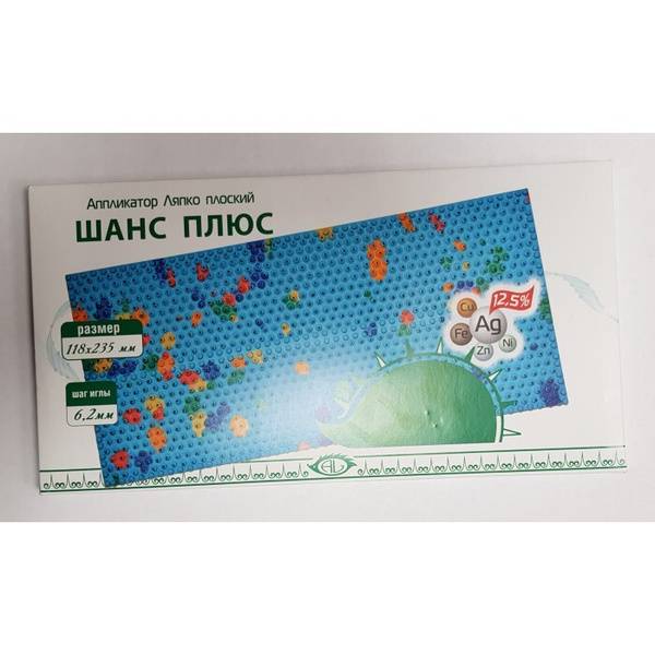 The Lyapko "Chance Plus" flat applicator features a 6.2mm needle pitch and a 118x235mm size, boasting 750 needles. Made with medical-grade rubber and a unique blend of iron, copper, nickel, zinc, and silver, this applicator is available in blue, red, orange, green, and light blue. Ideal for individuals with a denser physique and thicker subcutaneous fat, or those with lower skin sensitivity, the "Chance Plus" can be used independently or in conjunction with other Lyapko applicators on various body areas. Experience targeted therapy and effective pain relief with this high-quality applicator.