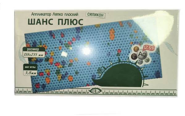 Description: The Lyapko "Shans Plus" flat applicator features a 5.8mm needle pitch, measuring 118x235mm and containing 890 needles. Made with medical-grade silicone and a blend of iron, copper, nickel, zinc, and silver, its versatile needle pitch suits most users. Ideal for independent use or in conjunction with other Lyapko applicators on various body areas.