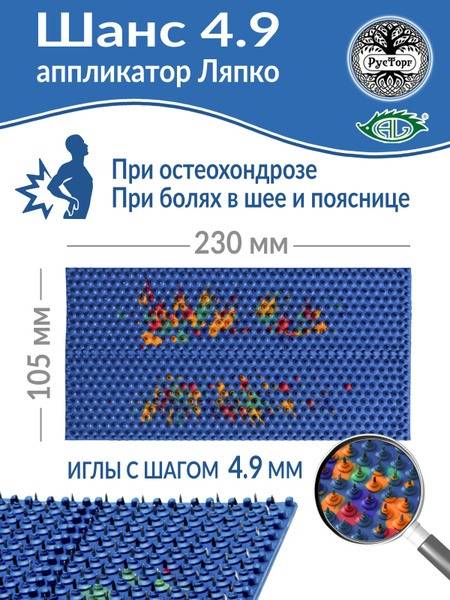 Experience the therapeutic benefits of the Lyapko Chance 4.9 applicator mat, perfect for sensitive skin and children. Its small needle spacing (4.9 mm) provides gentle yet effective stimulation. Measuring 105x230 mm and featuring 1022 needles, this mat is composed of medical-grade rubber and a unique blend of iron, copper, nickel, zinc, and silver. Available in blue, red, orange, green, and light blue.