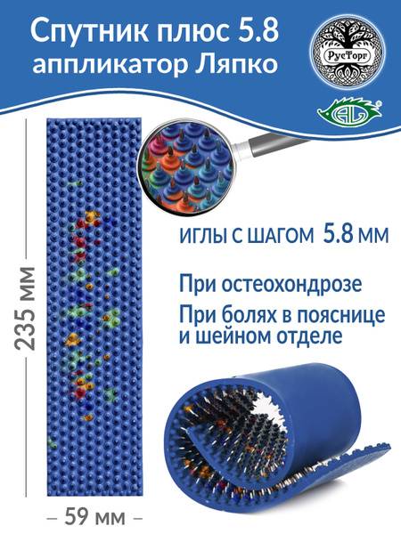 Experience targeted pain relief with the Lyapko Sputnik Plus 5.8 acupuncture mat. This flat, blue mat features a 5.8 mm needle spacing and 445 needles composed of iron, copper, nickel, zinc, silver, and medical-grade rubber. Its dimensions (59 x 235 mm) allow for precise application to the neck, chest, and lower back, providing localized relief to areas of pain. The Lyapko Sputnik Plus 5.8 offers a convenient and effective alternative to mustard plasters for cold relief.