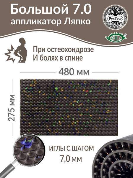 The Lyapko Large Mat Applicator (brown) features a 7.0 mm needle spacing across its large 275 x 480 mm surface area, containing 2710 needles. Made with medical-grade rubber and a blend of iron, copper, nickel, zinc, and silver, this applicator offers superior therapeutic efficacy due to its increased surface area and wider needle spacing.