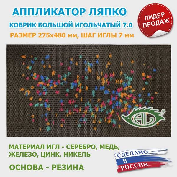 Experience the therapeutic benefits of the Lyapko Large Mat 7.0 (275 x 480 mm), featuring a 7.0 mm needle spacing and 2710 needles. This large acupuncture mat is crafted from medical-grade rubber and a unique blend of metals (iron, copper, nickel, zinc, silver) for enhanced therapeutic effect. Its expansive surface area and wider needle spacing provide superior coverage and deeper stimulation, making it ideal for back pain relief, improved digestion, and weight management. Use it lying down, sitting, or even standing for targeted treatment of digestive issues (colitis, dyskinesia, constipation), and to address abdominal fat deposits. The Lyapko Large Mat 7.0 offers effective pain relief and contributes to overall well-being as part of a comprehensive treatment plan.