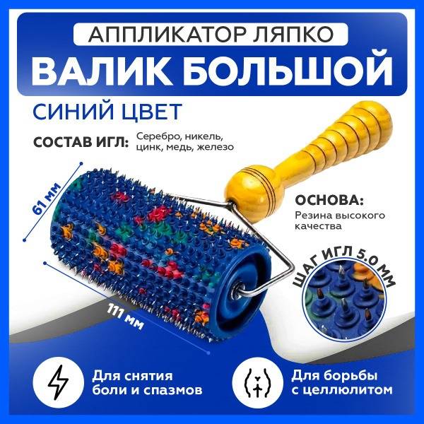 The Lyapko Large M 5.0 roller applicator is a versatile and effective massager designed for large areas of the body, including the thighs, abdomen, and back. This cylindrical massager features a hypoallergenic rubber base with needles made from a blend of medically beneficial metals: copper, silver, zinc, and iron. These metals contribute to the body's overall well-being and are essential for optimal functioning.