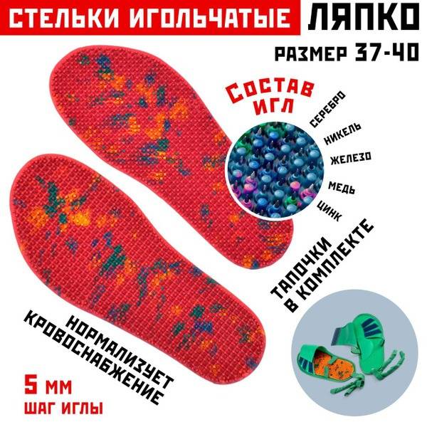 Designed for comfortable, everyday use, the Lyapko "Skorohod Plus" insoles feature a needle spacing of 5.02 mm and are available in sizes 37-40 (US 6.5-8.5, UK 5.5-7.5, EU 38-41). Each pair includes two insoles. The insoles are also versatile and can be used as a standard applicator on any area of the body.