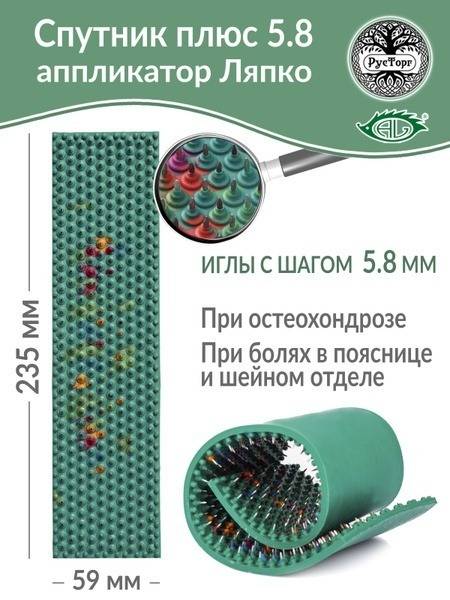 Experience targeted pain relief with the Lyapko Sputnik Plus 5.8 Ag flat applicator. This 59 x 235 mm mat features a 5.8 mm needle spacing and 445 needles made of iron, copper, nickel, zinc, silver, and medical-grade rubber. Ideal for localized treatment of neck, chest, and lower back pain, it can be strategically positioned for maximum impact. Also effective as a natural alternative to mustard plasters for cold symptoms.