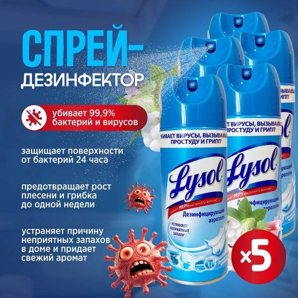 Lysol Disinfectant Spray Cotton Freshness (5 x 400ml) kills 99.9% of viruses and bacteria, including those that cause cold and flu. Its broad-spectrum efficacy targets influenza viruses, parainfluenza viruses, other acute respiratory infection pathogens, rhinovirus, enteroviruses, rotaviruses, poliovirus, enteral and parenteral hepatitis viruses, herpes viruses, atypical pneumonia viruses, adenoviruses, and HIV. It's also effective against gram-negative and gram-positive bacteria (including hospital-acquired infection pathogens, excluding tuberculosis), such as Staphylococcus aureus, E. coli, Streptococcus, and Salmonella. This powerful disinfectant boasts fungicidal activity against Aspergillus niger, Candida albicans, Trichophyton, and Penicillium chrysogenum. Eliminate unpleasant odors and prevent mold and mildew growth for up to one week on both hard and soft surfaces. Chlorine-free formula. Buy now and experience the clean, fresh scent of Lysol.