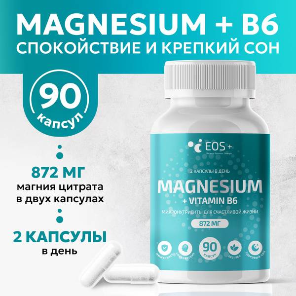 Magnesium B6, Magnesium Supplement, Vitamin B6 Supplement, Immune Support, Muscle Cramps, Sleep Improvement, Migraine Relief, Anxiety Relief, Nerve Health, Cardiovascular Health, Bone Health, Energy Booster, Stress Relief, EOS+, 90 Capsules, 40mg Magnesium, Dietary Supplement.