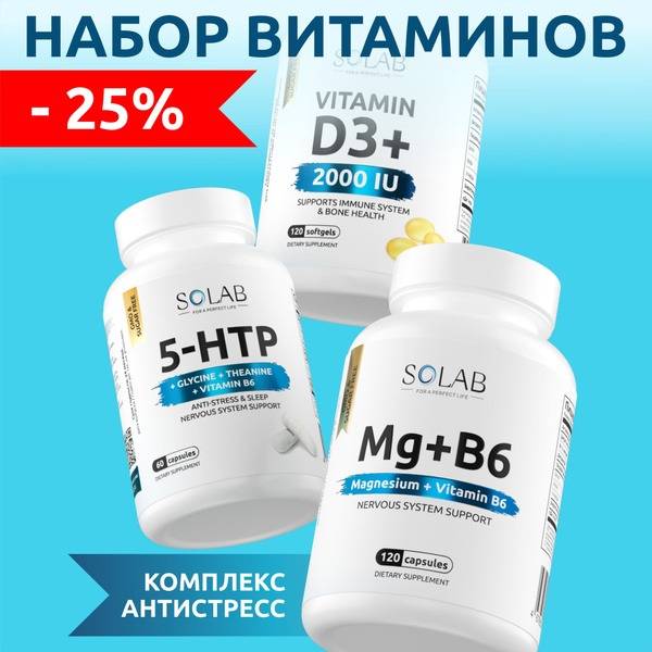 Combat stress and boost well-being with SOLAB's comprehensive anti-stress supplement kit. This powerful combination of Magnesium B6, 5-HTP with Glycine, and Vitamin D3 2000 IU (plus a bonus Vitamin D3 supplement!) supports nervous system health, improves resilience, and enhances immunity.