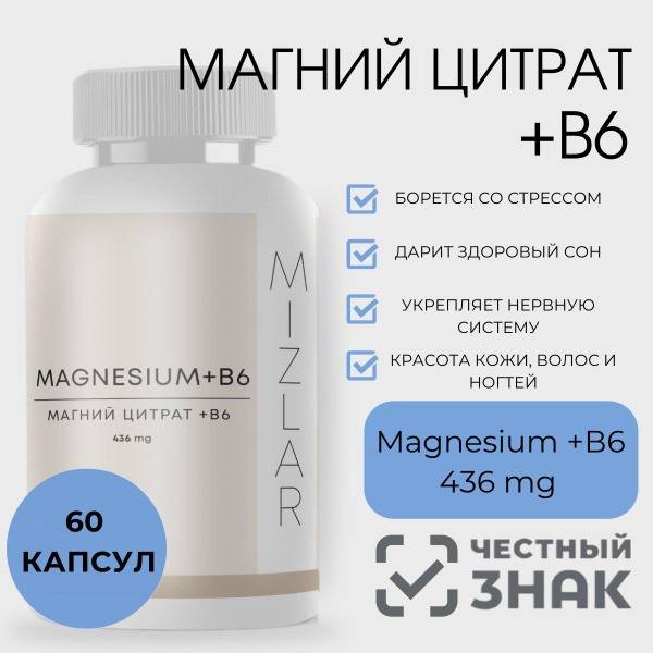 Description: Mizlar, a brand developed by certified nutritionist Svetlana Erkaeva, offers high-quality nutritional supplements meeting global standards. Our Magnesium Citrate B6 complex (436mg) ensures optimal magnesium absorption and utilization. This highly bioavailable formula regulates key metabolic processes, supporting nervous and cardiovascular system health. Often used to combat stress, fatigue, and even symptoms of depression, Magnesium B6 may help alleviate muscle spasms and cramps associated with magnesium deficiency. Mizlar: Nourishing your well-being.