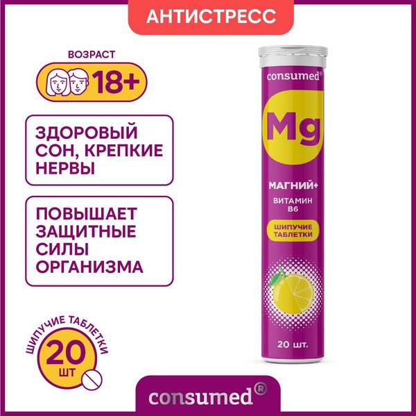 Description: Magnesium B6 Consumed offers the perfect blend of active ingredients to strengthen your nervous system. Magnesium, a crucial anti-stress mineral, promotes nervous system health, calmness, increased stress resilience, and relief from anxiety and irritability. Vitamin B6 enhances magnesium absorption and metabolism, crucial given its rapid elimination from the body. This supplement also supports immune function, cardiovascular health, healthy blood circulation, and muscle relaxation. Suitable for both men and women, it features convenient effervescent tablets with a pleasant lemon flavor. Contraindications: Individual component intolerance, pregnancy, breastfeeding, carbohydrate metabolism disorders, phenylketonuria.