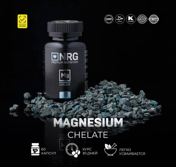 Magnesium chelate, magnesium supplement, energy supplement, stress relief, muscle function, heart health, bone health, sleep improvement, electrolyte balance, Halal, Kosher, premium quality, NRG Premium Nutrition, dietary supplement, RDI, TR CU 022/2011
