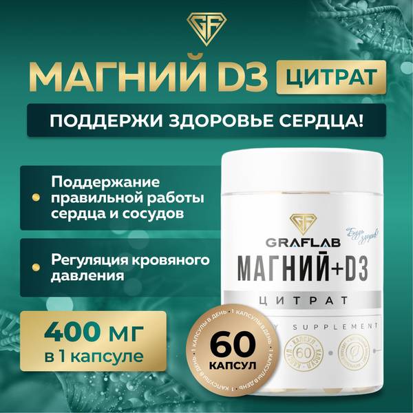 Description: Support your overall well-being with Magnesium Citrate D3 400mg. This comprehensive supplement is ideal for individuals seeking to strengthen bones, improve muscle function, and support nervous system health. High-bioavailability magnesium citrate ensures rapid and efficient absorption, effectively addressing magnesium deficiencies. This contributes to normalized energy metabolism, muscle relaxation, and stress management. Vitamin D3 enhances the absorption of both magnesium and calcium, promoting stronger bones, teeth, and joints. It also boosts immunity, supporting your body's defenses and reducing inflammation. This GraFLab formula is beneficial during physical and mental stress, improving sleep quality, reducing fatigue and irritability, and contributing to healthy blood pressure and cardiovascular function. Recommended for all ages, especially those experiencing high stress, demanding lifestyles, or limited sun exposure. Maintain optimal health with regular intake of Magnesium Citrate D3.