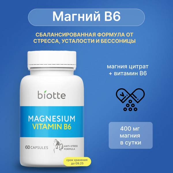 Keywords: Magnesium Citrate, Vitamin B6, Magnesium B6, Stress Relief, Anxiety Relief, Sleep Aid, Sleep Support, Muscle Relaxation, Migraine Prevention, Migraine Relief, Bioavailable Magnesium, Enteric Coated Capsules, Natural Sleep Aid, Stress Supplement, Anxiety Supplement, Biotte