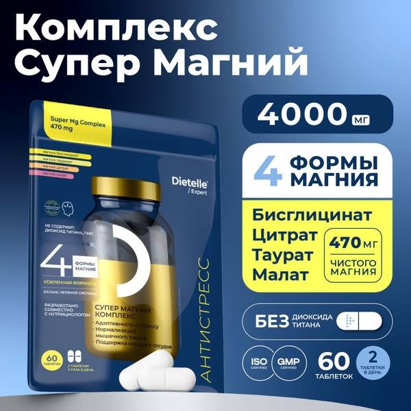 Keywords: Magnesium complex, magnesium bisglycinate, magnesium malate, magnesium citrate, magnesium taurate, heart health, cardiovascular health, stress relief, anxiety relief, sleep aid, fatigue relief, muscle cramps, energy boost, superior absorption, chelated magnesium, Dietelle Expert, dietary supplement, vitamins and minerals.