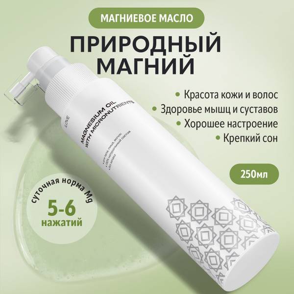ILOVE Mg Magnesium Oil is a completely natural and unique remedy for rapid body restoration and strengthening. This highly concentrated magnesium chloride solution absorbs quickly through the skin, delivering essential vitamins and minerals. It's considered the purest source of magnesium, effectively replenishing deficiencies directly through cutaneous absorption. Beyond magnesium, it's enriched with vital trace minerals acting as natural biostimulants: iodine, silicon, boron, iron, zinc, copper, molybdenum, selenium, and silver. Regular use helps relieve muscle pain, spasms, and joint problems, strengthens bones and nails, promotes hair growth and prevents hair loss. It offers overall body strengthening, boosts the immune system, and provides relief from nervous tension and chronic fatigue, promoting relaxation and improved sleep. Experience the revitalizing power of ILOVE Mg.
