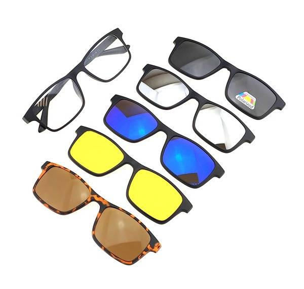 Experience the versatility of RAINBOW EFFECT 5-in-1 magnetic clip-on sunglasses. This stylish set includes five interchangeable lenses for every occasion: amber lenses for superior comfort in bright sunlight; blue lenses for a fashionable and romantic look; grey lenses for polarization protection against glare; mirrored lenses for a trendy and sophisticated style; and yellow lenses for enhanced driving vision, reducing eye strain and improving comfort. The frame and clips (excluding lenses) are crafted from high-quality TR90 plastic, offering exceptional flexibility, lightweight design (25% lighter than comparable materials), hypoallergenic properties, and superior durability (withstanding drops from significant heights). This durable material also resists extreme temperatures, from -30°C to +80°C. Includes a protective case.