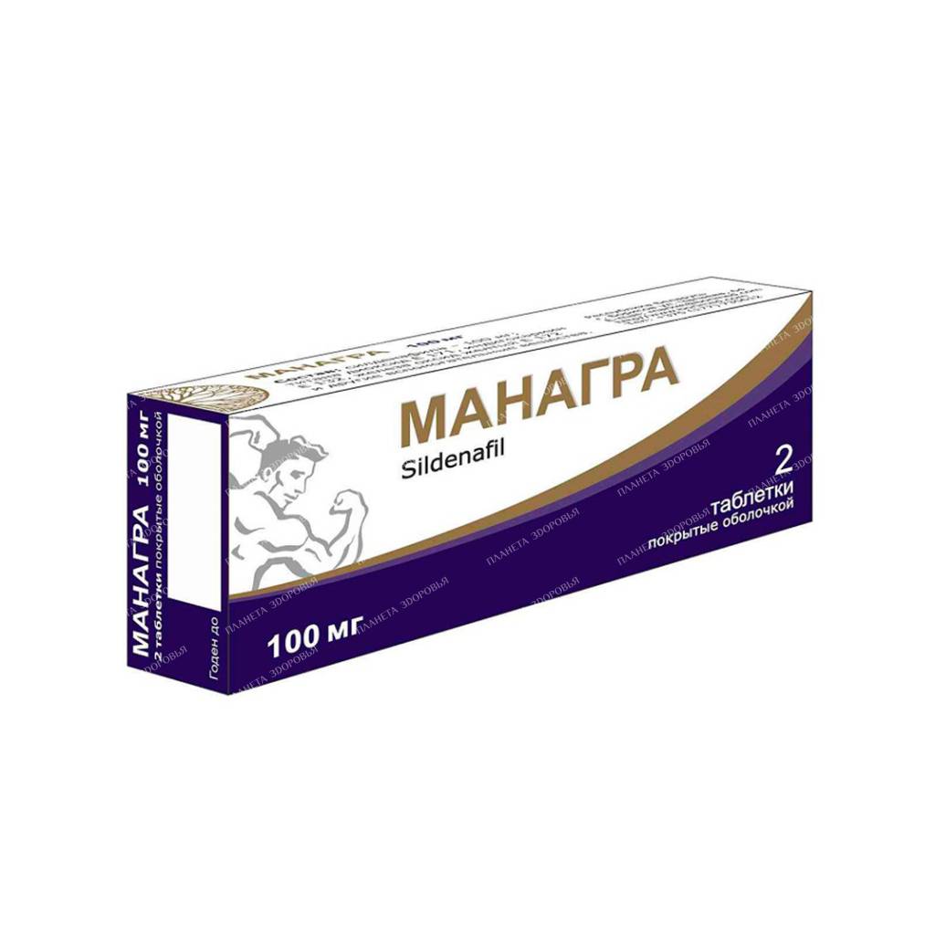 Name: Managra. Release form Coated tablets. Dosage 100 mg. Pack quantity: 2 pcs. Producer Borisov ZMP. MNNsildenafil. FTHERectile dysfunction treatment, PDE-5 inhibitor. Description: Pills are film-coated, blue, round, with a biconvex surface. Composition 1 tablet contains: active substance: sildenafil (in the form of sildenafil citrate) - 50 mg or 100 mg; excipients: calcium hydrogen phosphate, sodium croscarmellose, magnesium stearate, microcrystalline cellulose, Opadry II (including polyvinyl alcohol, partially hydrolyzed; talc; macrogol 3350 (polyethylene glycol); lecithin (soy); titanium dioxide E 171; iron oxide yellow E 172; aluminum varnish based on indigo carmine E 132). Pharmacotherapeutic groupMeans used for erectile dysfunction. Sildenafil. ATX code: G04BE03. Indications for use Sildenafil is indicated for adult men with erectile dysfunction, characterized by an inability to achieve or maintain an erection level necessary for satisfactory intercourse. For the effective action of the drug, sexual stimulation is necessary. Contraindications Hypersensitivity; simultaneous reception of donors of nitric oxide or nitrates in any form. Contraindicated in patients with loss of vision in one eye associated with anterior ischemic optic neuropathy not due to arteritis (NAION), regardless of the association of vision loss with previous use of PDE-5 inhibitors. Taking the drug is contraindicated in the presence of severe liver failure, arterial hypotension (BP<90/50 mmHg), patients with a recent stroke or myocardial infarction, in the presence of hereditary degenerative disorders of the retina, such as retinitis pigmentosa (a small proportion of these patients have genetic disorders of retinal phosphodiesterase). Erectile dysfunction medications, including sildenafil, should not be used by people for whom sexual activity is not recommended (patients with severe cardiovascular disease such as unstable angina or severe heart failure). Method of administration and dosage The recommended dose, taken approximately 1 hour before sexual activity, is 50 mg. Depending on the effectiveness and tolerability of the drug, the dose may be increased to a maximum of 100 mg or reduced to 25 mg. The maximum dose frequency is 1 time per day. Managra 50 mg and 100 mg tablets are not divided into parts. If it is necessary to use a dose of sildenafil 25 mg, it is recommended to use another drug. Use in patients with impaired renal function In patients with severe renal impairment (creatinine clearance <30 ml / min), an initial dose of 25 mg should be used. Use in patients with impaired liver function It is recommended to use an initial dose of 25 mg. Use in patients taking other medicinal products With the exception of ritonavir, whose simultaneous administration with sildenafil is contraindicated, for patients receiving inhibitors of drug metabolism (for example, erythromycin, ketoconazole, cimetidine), an initial dose of sildenafil 25 mg is recommended. Patients should be in a stable condition during treatment with α-blockers before starting the use of sildenafil. In such cases, it is recommended to start the use of sildenafil with a dose of 25 mg. Use in children Not indicated for children and adolescents (under 18 years of age). Use in Elderly Patients Patients over 65 years of age are recommended to start taking sildenafil with a dose of 25 mg. Side effects If you develop any of the following serious side effects, stop taking sildenafil and seek medical attention immediately: Allergic reaction - occurs infrequently (may affect up to 1 in 100 people). Symptoms: sudden hoarseness, difficulty breathing or dizziness, swelling of the eyelids, face, lips or throat. Chest pain - develops infrequently. If this symptom occurs during or after intercourse, take a semi-sitting position and try to relax, do not use nitrates for treatment. Prolonged and sometimes painful erections are rare (may affect up to 1 in 1,000 people). If an erection lasts more than 4 hours, you should immediately consult a doctor. A sharp decrease or loss of vision - rarely develop. Serious skin reactions are rare. Symptoms may include: severe peeling and swelling of the skin, blistering in the mouth, on the genitals and around the eyes, fever. Seizures or seizures are rare. Other side effects: Very common (may affect > 1 in 10 people): headache. Common (may affect < 1 in 10 people): Nausea, facial flushing, hot flashes (sudden feeling of heat in the upper body), indigestion, color perception problems, blurred vision, blurred vision, nasal congestion, and dizziness. Uncommon (may affect < 1 in 100 people): vomiting, skin rash, eye irritation, flushing/redness of the eyes, eye pain, flashes of light in the eyes, blurred vision, photosensitivity, watery eyes, palpitations, rapid heartbeat, high blood pressure , low blood pressure, muscle pain, feeling drowsy, decreased tactile sensation, dizziness, ringing in the ears, dry mouth, sinus congestion, inflammation of the nasal mucosa (symptoms include: runny nose, sneezing and nasal congestion), pain in the upper part stomach, gastroesophageal reflux disease (symptoms include heartburn), blood in the urine, pain in the arms or legs, nosebleeds, feeling hot and tired. Rare (may affect < 1 in 1,000 people): syncope, stroke, myocardial infarction, irregular heartbeat, temporary decrease in blood flow in some areas of the brain, tightness in the throat, numbness in the mouth, posterior chamber hemorrhage, double vision, decreased visual acuity, unusual sensation in the eye, swelling of the eye or eyelid, small particles or spots in the field of vision, the appearance of iridescent halos around light sources, pupil dilation, impaired perception of white in the eye, bleeding from the penis, blood in the semen, dry nose , swelling of the nasal mucosa, a feeling of irritation and sudden worsening or loss of hearing. Rare cases of unstable angina (heart disease) and sudden death have been reported. Most of 