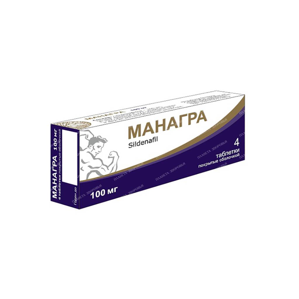 Name: Managra. Release form Coated tablets. Dosage 100 mg. Pack quantity: 2 pcs. Producer Borisov ZMP. MNNsildenafil. FTHERectile dysfunction treatment, PDE-5 inhibitor. Description: Pills are film-coated, blue, round, with a biconvex surface. Composition 1 tablet contains: active substance: sildenafil (in the form of sildenafil citrate) - 50 mg or 100 mg; excipients: calcium hydrogen phosphate, sodium croscarmellose, magnesium stearate, microcrystalline cellulose, Opadry II (including polyvinyl alcohol, partially hydrolyzed; talc; macrogol 3350 (polyethylene glycol); lecithin (soy); titanium dioxide E 171; iron oxide yellow E 172; aluminum varnish based on indigo carmine E 132). Pharmacotherapeutic groupMeans used for erectile dysfunction. Sildenafil. ATX code: G04BE03. Indications for use Sildenafil is indicated for adult men with erectile dysfunction, characterized by an inability to achieve or maintain an erection level necessary for satisfactory intercourse. For the effective action of the drug, sexual stimulation is necessary. Contraindications Hypersensitivity; simultaneous reception of donors of nitric oxide or nitrates in any form. Contraindicated in patients with loss of vision in one eye associated with anterior ischemic optic neuropathy not due to arteritis (NAION), regardless of the association of vision loss with previous use of PDE-5 inhibitors. Taking the drug is contraindicated in the presence of severe liver failure, arterial hypotension (BP<90/50 mmHg), patients with a recent stroke or myocardial infarction, in the presence of hereditary degenerative disorders of the retina, such as retinitis pigmentosa (a small proportion of these patients have genetic disorders of retinal phosphodiesterase). Erectile dysfunction medications, including sildenafil, should not be used by people for whom sexual activity is not recommended (patients with severe cardiovascular disease such as unstable angina or severe heart failure). Method of administration and dosage The recommended dose, taken approximately 1 hour before sexual activity, is 50 mg. Depending on the effectiveness and tolerability of the drug, the dose may be increased to a maximum of 100 mg or reduced to 25 mg. The maximum dose frequency is 1 time per day. Managra 50 mg and 100 mg tablets are not divided into parts. If it is necessary to use a dose of sildenafil 25 mg, it is recommended to use another drug. Use in patients with impaired renal function In patients with severe renal impairment (creatinine clearance <30 ml / min), an initial dose of 25 mg should be used. Use in patients with impaired liver function It is recommended to use an initial dose of 25 mg. Use in patients taking other medicinal products With the exception of ritonavir, whose simultaneous administration with sildenafil is contraindicated, for patients receiving inhibitors of drug metabolism (for example, erythromycin, ketoconazole, cimetidine), an initial dose of sildenafil 25 mg is recommended. Patients should be in a stable condition during treatment with α-blockers before starting the use of sildenafil. In such cases, it is recommended to start the use of sildenafil with a dose of 25 mg. Use in children Not indicated for children and adolescents (under 18 years of age). Use in Elderly Patients Patients over 65 years of age are recommended to start taking sildenafil with a dose of 25 mg. Side effects If you develop any of the following serious side effects, stop taking sildenafil and seek medical attention immediately: Allergic reaction - occurs infrequently (may affect up to 1 in 100 people). Symptoms: sudden hoarseness, difficulty breathing or dizziness, swelling of the eyelids, face, lips or throat. Chest pain - develops infrequently. If this symptom occurs during or after intercourse, take a semi-sitting position and try to relax, do not use nitrates for treatment. Prolonged and sometimes painful erections are rare (may affect up to 1 in 1,000 people). If an erection lasts more than 4 hours, you should immediately consult a doctor. A sharp decrease or loss of vision - rarely develop. Serious skin reactions are rare. Symptoms may include: severe peeling and swelling of the skin, blistering in the mouth, on the genitals and around the eyes, fever. Seizures or seizures are rare. Other side effects: Very common (may affect > 1 in 10 people): headache. Common (may affect < 1 in 10 people): Nausea, facial flushing, hot flashes (sudden feeling of heat in the upper body), indigestion, color perception problems, blurred vision, blurred vision, nasal congestion, and dizziness. Uncommon (may affect < 1 in 100 people): vomiting, skin rash, eye irritation, flushing/redness of the eyes, eye pain, flashes of light in the eyes, blurred vision, photosensitivity, watery eyes, palpitations, rapid heartbeat, high blood pressure , low blood pressure, muscle pain, feeling drowsy, decreased tactile sensation, dizziness, ringing in the ears, dry mouth, sinus congestion, inflammation of the nasal mucosa (symptoms include: runny nose, sneezing and nasal congestion), pain in the upper part stomach, gastroesophageal reflux disease (symptoms include heartburn), blood in the urine, pain in the arms or legs, nosebleeds, feeling hot and tired. Rare (may affect < 1 in 1,000 people): syncope, stroke, myocardial infarction, irregular heartbeat, temporary decrease in blood flow in some areas of the brain, tightness in the throat, numbness in the mouth, posterior chamber hemorrhage, double vision, decreased visual acuity, unusual sensation in the eye, swelling of the eye or eyelid, small particles or spots in the field of vision, the appearance of iridescent halos around light sources, pupil dilation, impaired perception of white in the eye, bleeding from the penis, blood in the semen, dry nose , swelling of the nasal mucosa, a feeling of irritation and sudden worsening or loss of hearing. Rare cases of unstable angina (heart disease) and sudden death have been reported. Most of 