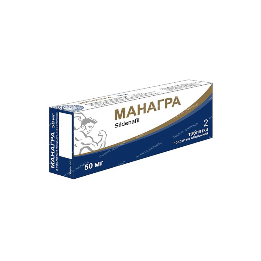 Name: Managra. Release form Coated tablets. Dosage 100 mg. Pack quantity: 2 pcs. Producer Borisov ZMP. MNNsildenafil. FTHERectile dysfunction treatment, PDE-5 inhibitor. Description: Pills are film-coated, blue, round, with a biconvex surface. Composition 1 tablet contains: active substance: sildenafil (in the form of sildenafil citrate) - 50 mg or 100 mg; excipients: calcium hydrogen phosphate, sodium croscarmellose, magnesium stearate, microcrystalline cellulose, Opadry II (including polyvinyl alcohol, partially hydrolyzed; talc; macrogol 3350 (polyethylene glycol); lecithin (soy); titanium dioxide E 171; iron oxide yellow E 172; aluminum varnish based on indigo carmine E 132). Pharmacotherapeutic groupMeans used for erectile dysfunction. Sildenafil. ATX code: G04BE03. Indications for use Sildenafil is indicated for adult men with erectile dysfunction, characterized by an inability to achieve or maintain an erection level necessary for satisfactory intercourse. For the effective action of the drug, sexual stimulation is necessary. Contraindications Hypersensitivity; simultaneous reception of donors of nitric oxide or nitrates in any form. Contraindicated in patients with loss of vision in one eye associated with anterior ischemic optic neuropathy not due to arteritis (NAION), regardless of the association of vision loss with previous use of PDE-5 inhibitors. Taking the drug is contraindicated in the presence of severe liver failure, arterial hypotension (BP<90/50 mmHg), patients with a recent stroke or myocardial infarction, in the presence of hereditary degenerative disorders of the retina, such as retinitis pigmentosa (a small proportion of these patients have genetic disorders of retinal phosphodiesterase). Erectile dysfunction medications, including sildenafil, should not be used by people for whom sexual activity is not recommended (patients with severe cardiovascular disease such as unstable angina or severe heart failure). Method of administration and dosage The recommended dose, taken approximately 1 hour before sexual activity, is 50 mg. Depending on the effectiveness and tolerability of the drug, the dose may be increased to a maximum of 100 mg or reduced to 25 mg. The maximum dose frequency is 1 time per day. Managra 50 mg and 100 mg tablets are not divided into parts. If it is necessary to use a dose of sildenafil 25 mg, it is recommended to use another drug. Use in patients with impaired renal function In patients with severe renal impairment (creatinine clearance <30 ml / min), an initial dose of 25 mg should be used. Use in patients with impaired liver function It is recommended to use an initial dose of 25 mg. Use in patients taking other medicinal products With the exception of ritonavir, whose simultaneous administration with sildenafil is contraindicated, for patients receiving inhibitors of drug metabolism (for example, erythromycin, ketoconazole, cimetidine), an initial dose of sildenafil 25 mg is recommended. Patients should be in a stable condition during treatment with α-blockers before starting the use of sildenafil. In such cases, it is recommended to start the use of sildenafil with a dose of 25 mg. Use in children Not indicated for children and adolescents (under 18 years of age). Use in Elderly Patients Patients over 65 years of age are recommended to start taking sildenafil with a dose of 25 mg. Side effects If you develop any of the following serious side effects, stop taking sildenafil and seek medical attention immediately: Allergic reaction - occurs infrequently (may affect up to 1 in 100 people). Symptoms: sudden hoarseness, difficulty breathing or dizziness, swelling of the eyelids, face, lips or throat. Chest pain - develops infrequently. If this symptom occurs during or after intercourse, take a semi-sitting position and try to relax, do not use nitrates for treatment. Prolonged and sometimes painful erections are rare (may affect up to 1 in 1,000 people). If an erection lasts more than 4 hours, you should immediately consult a doctor. A sharp decrease or loss of vision - rarely develop. Serious skin reactions are rare. Symptoms may include: severe peeling and swelling of the skin, blistering in the mouth, on the genitals and around the eyes, fever. Seizures or seizures are rare. Other side effects: Very common (may affect > 1 in 10 people): headache. Common (may affect < 1 in 10 people): Nausea, facial flushing, hot flashes (sudden feeling of heat in the upper body), indigestion, color perception problems, blurred vision, blurred vision, nasal congestion, and dizziness. Uncommon (may affect < 1 in 100 people): vomiting, skin rash, eye irritation, flushing/redness of the eyes, eye pain, flashes of light in the eyes, blurred vision, photosensitivity, watery eyes, palpitations, rapid heartbeat, high blood pressure , low blood pressure, muscle pain, feeling drowsy, decreased tactile sensation, dizziness, ringing in the ears, dry mouth, sinus congestion, inflammation of the nasal mucosa (symptoms include: runny nose, sneezing and nasal congestion), pain in the upper part stomach, gastroesophageal reflux disease (symptoms include heartburn), blood in the urine, pain in the arms or legs, nosebleeds, feeling hot and tired. Rare (may affect < 1 in 1,000 people): syncope, stroke, myocardial infarction, irregular heartbeat, temporary decrease in blood flow in some areas of the brain, tightness in the throat, numbness in the mouth, posterior chamber hemorrhage, double vision, decreased visual acuity, unusual sensation in the eye, swelling of the eye or eyelid, small particles or spots in the field of vision, the appearance of iridescent halos around light sources, pupil dilation, impaired perception of white in the eye, bleeding from the penis, blood in the semen, dry nose , swelling of the nasal mucosa, a feeling of irritation and sudden worsening or loss of hearing. Rare cases of unstable angina (heart disease) and sudden death have been reported. Most of 
