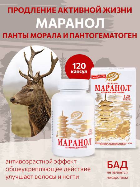 Maranol #120 is a potent natural adaptogen, formulated with precious extracts of Altai maral antlers and panthohaemogen β a unique substance derived from maral blood collected during antler velvet harvesting. Clinically proven to support immune function, protect the heart, circulatory system, musculoskeletal system, and combat premature aging throughout the body. Restore vitality, feel younger, and live longer, maintaining excellent well-being, mental clarity, and activity into advanced age. Extend your prime years and defy the aging process! For over two millennia, young, uncalcified maral antlers (velvet antler) have been used in traditional Chinese and Tibetan medicine to create life-extending elixirs. In Russia, maral antler velvet was a key component in the remedies of renowned Tibetan medicine practitioner, Peter Badmayev, personal physician to the last Russian Tsar, Nicholas II, and his family. Trust the powerful forces of nature and the centuries-old wisdom of Eastern medicine to achieve and maintain health, vitality, and mental clarity for years to come. (24g complete course)