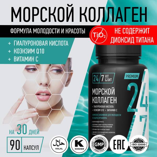 Marine collagen, hydrolyzed collagen, collagen peptides, vitamin C, hyaluronic acid, Coenzyme Q10, CoQ10, dietary supplement, beauty supplement, joint health, skin health, hair health, nail health, anti-aging, antioxidant, Halal, Kosher, GMP certified, 24/7 VIT&HIT, Type 1 collagen, fish collagen, hydrolyzed fish collagen, EAEU certified.