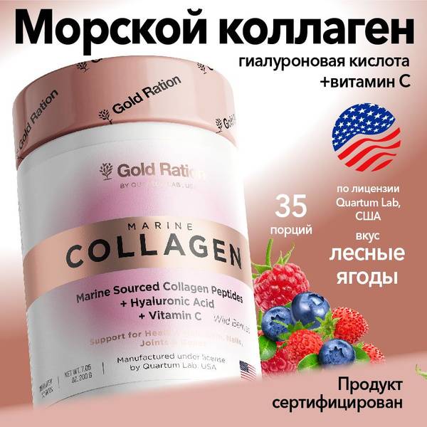 Gold Ration Marine Collagen, formulated by Quartum Lab (USA), combines the benefits of marine collagen with Vitamin C and Hyaluronic Acid. This supplement supports: improved skin elasticity and firmness; increased keratin production for stronger hair and nails; enhanced joint nutrition and synovial fluid production for healthier joints, ligaments, and cartilage. Manufactured in Russia using Quartum Lab (USA) formulas and raw materials, a leading developer of vitamins and dietary supplements. Experience the Gold Ration difference – 200g of berry-flavored goodness for your overall well-being.