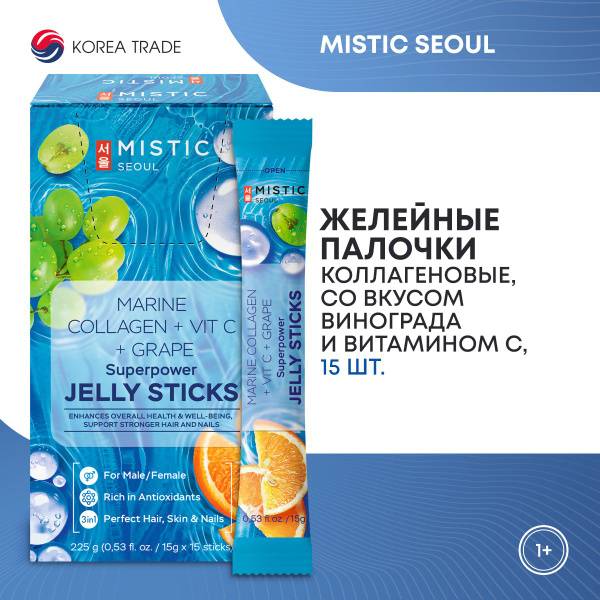 Experience the beauty-boosting power of MISTIC Marine Collagen Grape Jelly Sticks. Each delicious stick combines easily-absorbed marine collagen to support skin elasticity, hair, nail, and joint health, with the immune-supporting benefits of Vitamin C. Naturally enriched with green grape concentrate, these jellies provide a potent antioxidant boost and a delicious source of vitamins and fiber. Enjoy a low-calorie, prebiotic-enhanced treat for radiant skin and overall well-being. Convenient single-serve packs make maintaining your beauty routine effortless.
