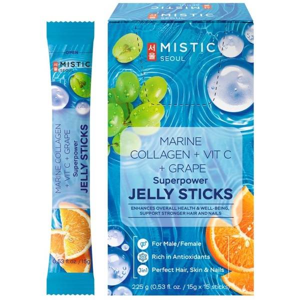 Marine collagen, collagen supplements, vitamin C, grape, jelly sticks, skin health, hair health, nail health, joint health, immune support, antioxidants, prebiotic, dietary fiber, low-calorie, beauty supplements, healthy snacks, Mistic Marine Collagen, collagen gummies, beauty gummies.