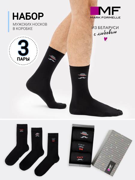 Description: Experience superior comfort with this 3-pair gift set of Mark Formelle men's classic high cotton socks. Presented in elegant gift packaging, these socks are a wardrobe essential. Featuring reinforced heel and toe for enhanced durability, a taller cuff for superior support, and crafted from premium combed cotton, these socks offer a luxurious feel against the skin. Their soft, breathable, and stretchy fabric ensures all-day comfort. Available in sizes 39-44, you'll find the perfect fit. The sleek, solid-color design (no prints or logos) makes them versatile enough for any occasion β whether it's a casual day at home, a business meeting, or a weekend sporting event. These socks are ideal year-round, and make a thoughtful gift for birthdays, Valentine's Day (February 14th), or Defender of the Fatherland Day (February 23rd). Mark Formelle β Belarusian-made quality you can trust.