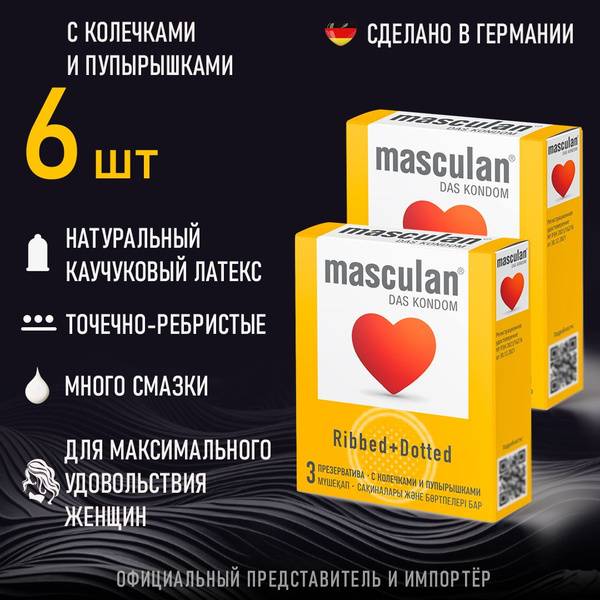Experience enhanced pleasure with Masculan Ribbed & Dotted condoms. This 6-pack (2 packs of 3) features textured condoms designed to heighten intimacy and sensation for both partners. Made from natural pink latex, these condoms offer a comfortable fit thanks to their thin (0.065-0.075mm) design and ample lubrication (650±50 mg). The added ribbed and dotted texture, along with a reservoir tip, ensures a pleasurable experience. Each condom is electronically tested and measures 190±5mm in length and 53±1mm in width. The cuff thickness is 1.05+0.3mm. Please note: Packaging design may vary. Product quality remains consistent. Masculan condoms provide reliable protection against pregnancy and STIs.