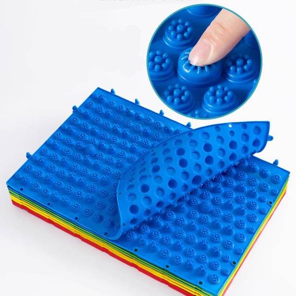 Experience the benefits of acupressure with our 4-piece massage mat set. Each module measures 38 x 26 cm and offers medium firmness. Interlocking modules easily assemble into a mat or pathway, and the set conveniently rolls up for storage. Perfect for children and adults, this versatile mat is ideal for home use or in childcare settings as an alternative to orthopedic foot mats. The varying heights of the textured surface stimulate foot reflexology points, strengthening leg muscles and promoting overall well-being with daily use.