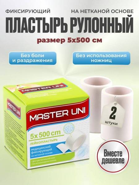 Master UNI Fixative Roll Plaster provides reliable, breathable fixation for bandages, compresses, and medical devices. This hypoallergenic plaster is made from a soft, non-woven microporous cellulose fabric, allowing for excellent air permeability and comfortable wear. Its gentle, hypoallergenic polyacrylate adhesive ensures painless application and removal, making it suitable even for sensitive skin and children. The unique design allows for easy tear-ability without scissors, adding convenience to its already practical features. Each roll measures 5cm x 500cm, providing ample length for various applications. With its secure hold and comfortable breathability, Master UNI Fixative Roll Plaster is the ideal solution for secure and comfortable wound care and medical device fixation. This pack contains two rolls.