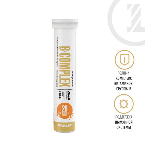 Keywords: Maxler B-Complex, B vitamins, effervescent tablets, orange flavor, immune support, energy, metabolism, nervous system, cognitive function, blood cells, tissue repair, mood, sleep, dietary supplement, vitamin B1, vitamin B2, vitamin B3, vitamin B5, vitamin B6, vitamin B9, vitamin B12, health supplements, wellbeing.