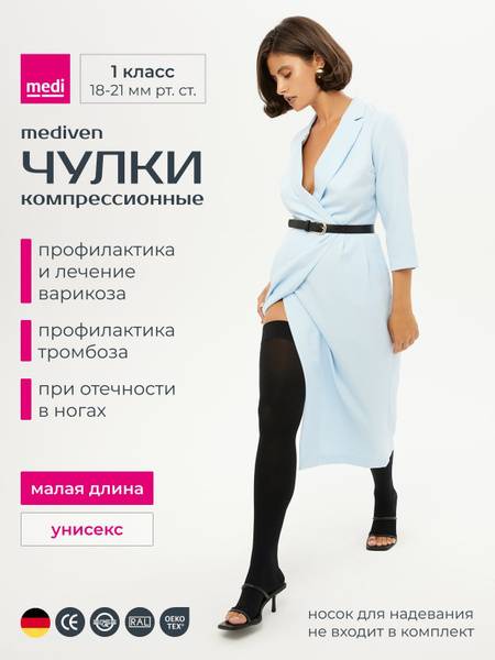 Mediven's black Class 1 compression stockings offer a perfect blend of medical efficacy and all-day comfort. With a compression level of 18-21 mmHg at the ankles, these stockings significantly improve blood circulation, preventing venous blood pooling. Recommended for individuals with low to moderate risk of venous thromboembolism (VTE), they provide effective prophylaxis against varicose veins and aid in post-operative recovery, reducing swelling, cramps, and leg heaviness.