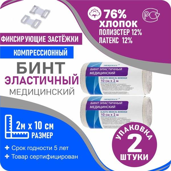 Description: This 2m x 10cm Meridian medical elastic bandage is crafted from breathable, hypoallergenic natural materials (76% cotton, 12% latex, 12% polyester), allowing your skin to breathe even during strenuous activity. Neatly finished edges and two convenient clips ensure a secure and comfortable fit. Its consistent texture and smooth edges provide a snug, even compression to any body part, including ankles, elbows, knees, and shoulders. This medium-stretch bandage is ideal for: therapeutic and preventative care; pre- and post-operative use; and treating chronic venous insufficiency and superficial thrombophlebitis (varicose veins in the upper and lower extremities, stages 1 and 2). Experience superior comfort and support with the Meridian elastic compression bandage.
