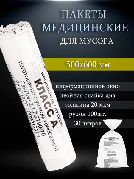 High-quality Class A medical waste bags, designed for the safe and compliant disposal of non-hazardous medical waste in healthcare facilities. These single-use, white bags are perfect for waste not in contact with biological fluids, infectious patients, or toxins. Examples include food waste (excluding infectious disease units), furniture, equipment (non-toxic), non-infected paper, and construction debris. Meeting all relevant Russian sanitary and epidemiological regulations, these bags feature a double-bottom seam for superior strength and labeled windows for easy identification and marking. Proper sealing virtually eliminates the risk of infection spread. Registered in the Russian State Register of Medical Devices and Medical Equipment. Manufacturer's 1-year warranty. 500x600mm dimensions, pack of 100.
