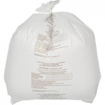 High-density polyethylene (HDPE) medical waste bags, Class A, designed for efficient collection, storage, and disposal of non-hazardous medical waste. These durable, white bags feature a 60-liter capacity and measure 70x80cm (27.6x31.5 inches) with a 13-micron thick wall. Each bag includes 150mm (5.9 inch) side gussets for added strength and capacity. Ideal for non-infectious waste such as general food waste from non-infectious areas of healthcare facilities (excluding infectious disease, dermatology, and phthisiatric units). A central information window allows for clear labeling with waste class, facility name, responsible party's full name, and collection date. Manufacturer information, TU number, and RU registration number are also printed on each bag, ensuring compliance with regulations. These bags hold up to 15kg (33lbs) and come in packs of 500, with 50 packs per shipping carton. Choose reliable, compliant waste disposal solutions with our Class A white medical waste bags.