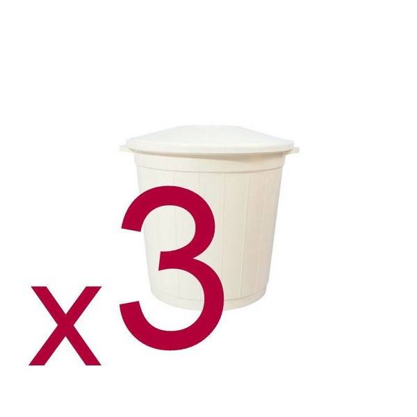 This listing features a pack of three 50-liter, white, Class A medical waste bins with lids. These reusable bins, designed for primary medical waste collection in healthcare facilities, are made of durable plastic and include lids and labels. For optimal safety and compliance, use with appropriate-sized, Class A medical waste bags. Ideal for use in hospitals, clinics, and other healthcare settings. Sterilization-resistant design ensures durability and longevity.
