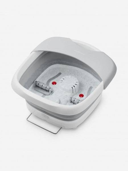 Indulge in luxurious at-home foot care with the Medisana FS 886 foldable foot spa. Enjoy soothing bubble and vibration massage, quickly heating water up to 45°C (113°F) for ultimate relaxation. This spa features a powerful massage function targeting reflex zones to relieve tired and aching feet. Safety clips prevent accidental folding during use, ensuring a secure and comfortable experience. Includes three interchangeable pedicure attachments: a pumice stone for callus removal, a brush for gentle cleansing, and a massage attachment for added pampering. Suitable for feet up to size 45 (US Men's 13/Women's 15). Compact and foldable for convenient storage.