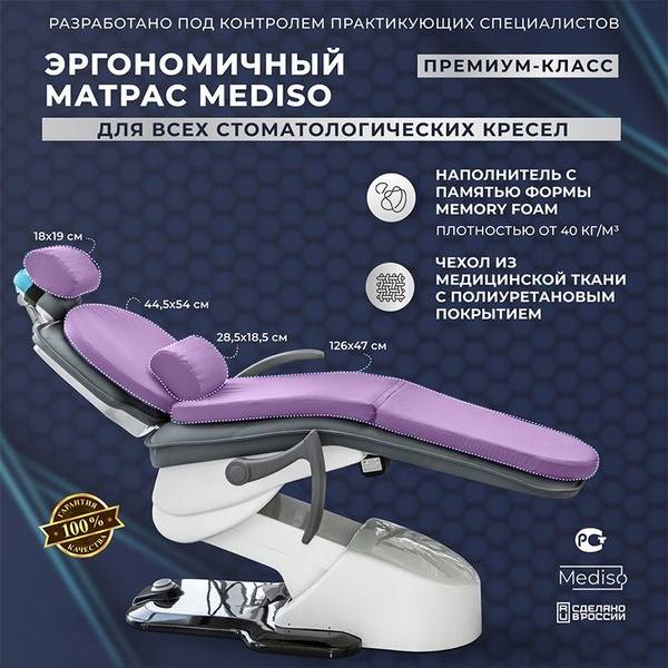 Elevate patient comfort during lengthy dental procedures with this premium memory foam dental mattress. Designed for aesthetic appeal and superior support, it fits most dental chairs. The removable cover is crafted from high-quality medical-grade fabric with a polyurethane coating for easy cleaning and hygiene. Includes a headrest and lumbar roll for complete support. One-year warranty. Made in Russia.