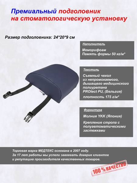 Description: The MEDTEX Dental Headrest Pillow (Model 122) provides superior neck support and comfort for your patients. Its unique anatomical design with ventilation channels relieves pressure and enhances the overall dental experience. This popular model features memory foam that conforms perfectly to the patient's anatomy, responding to their temperature and weight. The microporous structure ensures breathability, while the 50 kg/m³ density memory foam provides optimal support. Secure and easy attachment to your dental chair is achieved with straps and quick-release fasteners (fastex buckles) for a reliable fit on various installations.