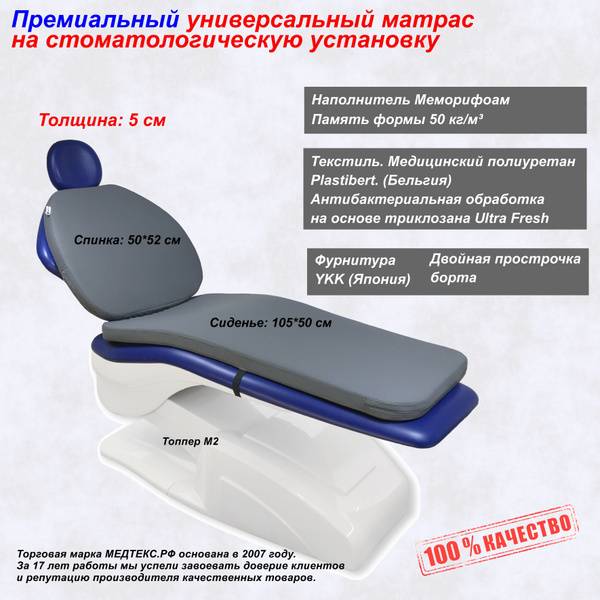 Description: Experience superior comfort and hygiene with the MEDTEX dental mattress. This premium memory foam mattress protects your dental chair upholstery while providing exceptional patient comfort. Featuring a 5cm thick memory foam layer for optimal orthopedic support, it's designed for perfect fit and easy attachment to virtually any dental chair. High-quality materials include a durable, anti-bacterial cover from Belgian textile manufacturer, RazNbey (Plastibert), utilizing Ultra Fresh technology with triclosan for enhanced hygiene. Secure YKK Japanese orthopedic fasteners ensure quick and reliable installation. Dimensions: Backrest 50x52cm, Seat 105x50cm. Upgrade your dental practice with MEDTEX – the ultimate in patient comfort and chair protection.