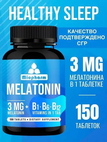 Experience superior sleep with Melatonin Blue Line, a premium sleep aid from Miopharm. These 150, 3mg melatonin tablets are enhanced with Vitamins B1, B6, and B12 for optimal sleep quality and faster sleep onset. Trusted for over 6 years in Russian pharmacies, Miopharm guarantees high-quality ingredients and rigorous manufacturing control. Melatonin helps regulate your sleep-wake cycle, improving sleep quality, reducing nighttime awakenings, and combating daytime fatigue. It also aids in adapting to jet lag. Vitamins B1, B6, and B12 support nervous system function, contributing to better sleep and overall well-being. B1 helps regulate nerve function and energy metabolism; B6 is crucial for amino acid metabolism and nervous system regulation; and B12 is essential for nerve cell regeneration and melatonin production. This comprehensive formula is recommended for individuals experiencing chronic insomnia or fatigue. Get the best value and quality with our 150-tablet bottle.