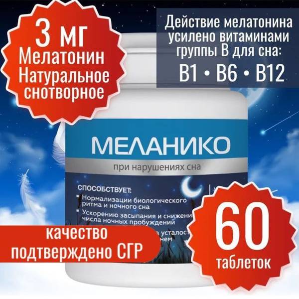 Keywords: Melatonin, MelaniCo, Miofarm, sleep aid, sleep tablets, insomnia, sleep disorder, sleep support, melatonin 3mg, vitamin B1, vitamin B6, vitamin B12, thiamine, pyridoxine, cyanocobalamin, fast asleep, restful sleep, jet lag, chronic insomnia, fatigue, sleep improvement, sleep quality, natural sleep aid, Russian pharmacy, high-quality sleep, affordable sleep aid.
