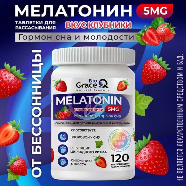 Melatonin 5mg, melatonin tablets, sleep aid, sleep tablets, sleep support, melatonin strawberry, chronic fatigue, stress relief, anxiety relief, depression relief, panic attack relief, weight loss support, healthy sleep, improved mood, immune support, antioxidant, anti-aging, hormonal balance, menopause relief, libido enhancement, cardiovascular health, Glycine alternative, EAEU certified, dietary supplement, Melatonin GraceBioQ, 120 tablets.